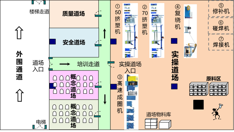 遠(yuǎn)東大學(xué)生產(chǎn)學(xué)院致力于打造行業(yè)內(nèi)首家一線員工實訓(xùn)道場,道場分為概念道場、安全培訓(xùn)區(qū)、質(zhì)量培訓(xùn)區(qū)及精益實操道場四大培訓(xùn)區(qū)域,旨在為公司培養(yǎng)具有發(fā)現(xiàn)問題、改善問題的能力、并掌握高水平實操技能的員工。概念道場即理論培訓(xùn)道場,以傳統(tǒng)課堂式、案例研討式、課題式等培訓(xùn)方式,對參訓(xùn)學(xué)員從思想認(rèn)知方面進(jìn)行工藝?yán)碚摰戎R的教學(xué);安全道場結(jié)合人、機、料、法、環(huán),設(shè)計危險源識別及預(yù)防相關(guān)道具,通過安全事故案例進(jìn)行安全教育;質(zhì)量道場以質(zhì)量事故案例警示教育和質(zhì)量問題產(chǎn)品展示為主,通過系統(tǒng)性的質(zhì)量培訓(xùn),培養(yǎng)員工的質(zhì)量意識,提高員工對產(chǎn)品缺陷的識別能力;精益實操道場主要通過情景模擬教學(xué)形式,以道場內(nèi)的設(shè)備進(jìn)行設(shè)備維護、自主保養(yǎng)、快速換模、標(biāo)準(zhǔn)化作業(yè)等培訓(xùn)內(nèi)容,是員工理論培訓(xùn)與實際操作相結(jié)合的堅實平臺。